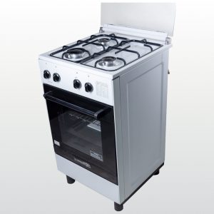 1 large and 2 medium gas burners with automatic piezo ignition. Gas oven manual. 100% enameled white body. Glass top cover. 49 liter oven capacity.