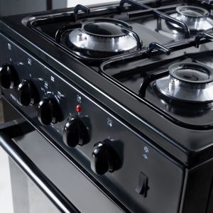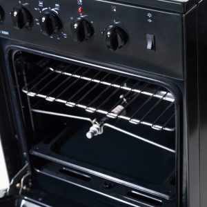 3 gas burners with automatic piezo ignition + 1 electric hotplate. Gas oven with thermostat control. 100% porcelain black body. Glass top cover. 49 liter oven capacity.